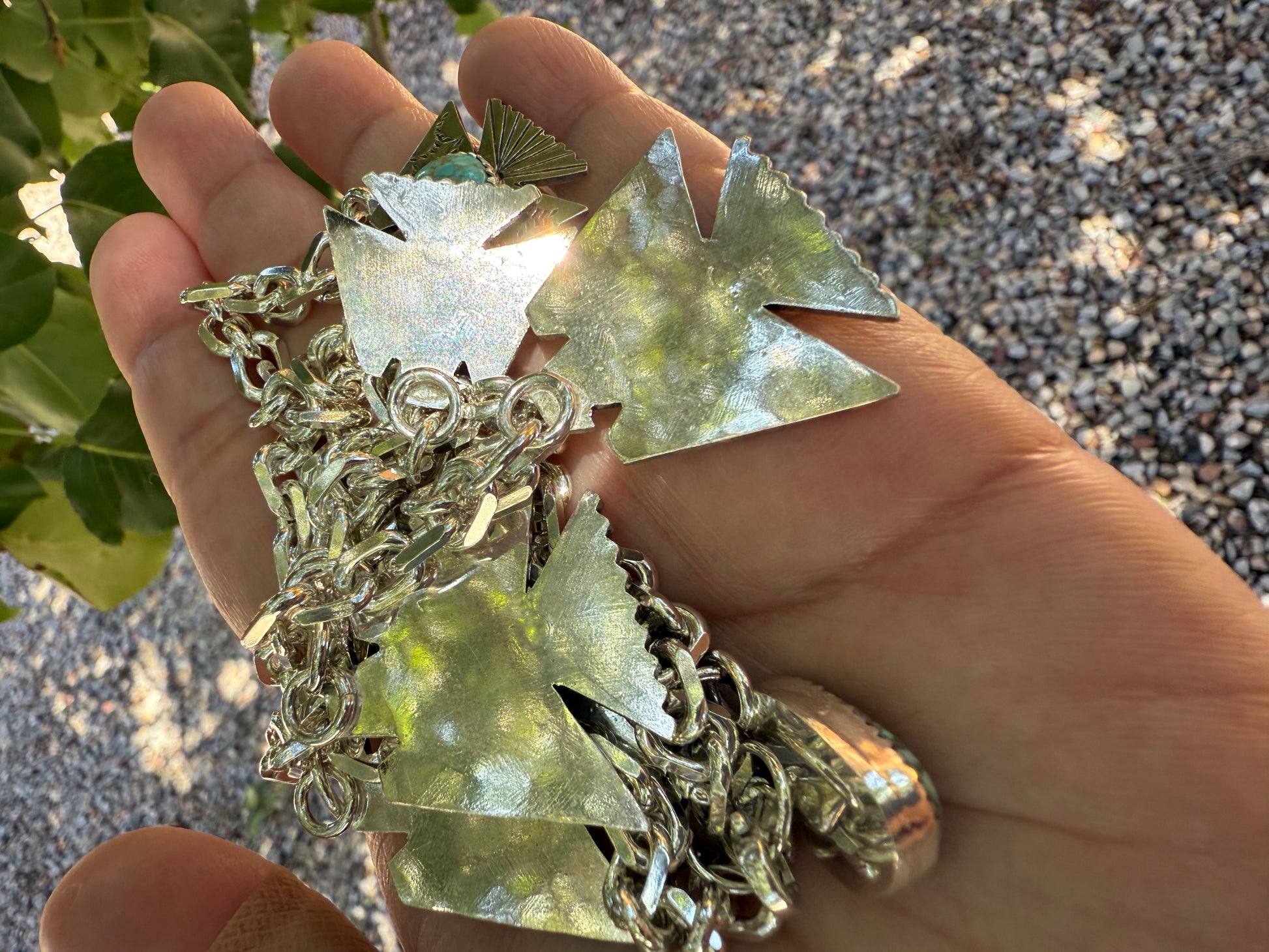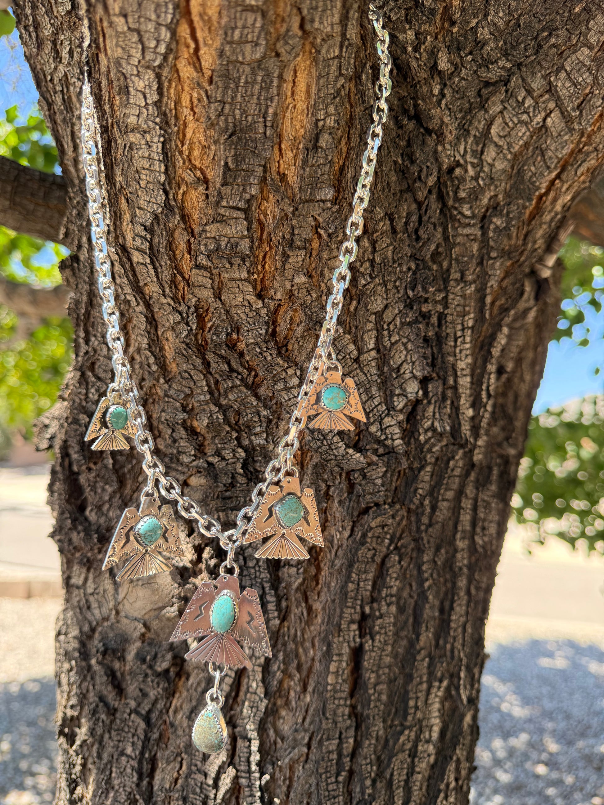- First center Thunderbird measures roughly 1.5 inches tall from top jumpring to bottom jumpring and just under 1.5 inches wide from left to right. Thunderbird measures 2.75 inches from top jumpring to bottom turquoise teardrop.